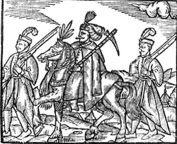 According to the Geography by Ptolemy, Sarmatia was considered to be territory of Poland, Lithuania, and Tartary and consisted of Asian and European parts divided by the Don River.[1] As a geographical term, Sarmatia was always indistinct, but very stable.[1] The presumed ancestors of the szlachta, the Sarmatians, were a confederacy of predominantly Iranian tribes living north of the Black Sea. In the 5th century BC Herodotus wrote that these tribes were descendants of the Scythians and Amazons. The Sarmatians were infiltrated by the Goths and others in the 2nd century AD, and may have had some strong and direct links to Poland.[7] The legend of Polish descent from Sarmatians stuck and grew until most of those within the Commonwealth, and many abroad, believed that many Polish nobles were descendants of the Sarmatians (Sauromates).[6] Another tradition came to surmise that the Sarmatians themselves were descended from Japheth, son of Noah.[8]