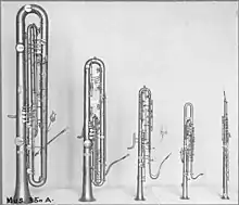 ![]() Sarrusophones, left to right: bass, baritone, tenor, alto, soprano. Metropolitan Museum of Art, New York | |