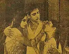 The casting of Krishnamurthy's wife Leelavathi was difficult; no actress was willing to play the character because the script required her to be physically abused and mistreated by her inebriated husband. In despair, the producer asked Mudaliar and Radha to cast M. R. Gnanambal, Radha's wife, in the role.[48] Gnanambal, who had retired from acting after her marriage, was initially reluctant to accept the role, but did so because no other actress would.[30][33] Leelavathi's daughter Lakshmi was played by M. K. Mani, a boy.[1] The film was also the feature debut of K. A. Thangavelu.[49][50]