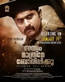Sathyam Mathrame Bodhippikku is a 2022 Indian Malayalam-language film written and directed by Sagar. It stars Dhyan Sreenivasan, Sreejith Ravi, Sudheesh, Ambika, Johny Antony. It was produced by Wichu Balamurali under the banner of Smruthi Cinemass and the music was composed by William Francis.[1] It was released on 14 January 2022.[2]