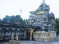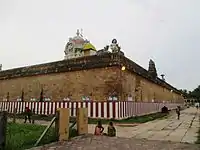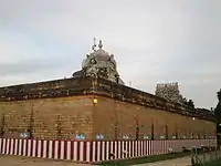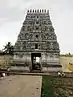 The temple has a vast Prakarams(courtyards) with high walls of enclosure. There are two sets of seven-tiered gopurams on the outer walls of the enclosure. The porch on the entrance from the second to the first prakara date back to 10th to 11th century.[10] The original shrine during the period of the Nayanmars included the shrine of Bhrammapureeswarar, on the southern bund of the temple tank; the Tonniappar shrine on a mound west of the central shrine, and the Sattanathar shrine in the second floor reached from the southern praharam(outer courtyard) of the Toniappar shrine by a flight of steps. The enlargement of the original temple happened during the period of Kulothunga Chola I, Vikrama Chola, Kulothunga Chola II and Kulothunga Chola III (as in Chidambaram - 11th through the 13th centuries).[11] The temple is a holy site for Hinduism and thousands of devotees come to pay homage to the deities.[12] The image of Parvathi in the form of Sthira Sundari is located in the basement in a separate shrine.[13]