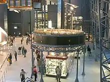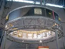 The Saturn V instrument unit is a ring-shaped structure fitted to the top of the Saturn V rocket's third stage (S-IVB) and the Saturn IB's second stage (also an S-IVB). It was immediately below the SLA (Spacecraft/Lunar Module Adapter) panels that contained the Apollo Lunar Module. The instrument unit contains the guidance system for the Saturn V rocket. Some of the electronics contained within the instrument unit are a digital computer, analog flight control computer, emergency detection system, inertial guidance platform, control accelerometers, and control rate gyros. The instrument unit (IU) for Saturn V was designed by NASA at Marshall Space Flight Center (MSFC) and was developed from the Saturn I IU.[1] NASA's contractor to manufacture the Saturn V Instrument Unit was International Business Machines (IBM).[2]