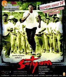 Sathyam (transl. Truth) is an Indian 2008 Tamil-language action drama film written and directed by debutante A. Rajasekhar (an associate of Suresh Krissna) in his directorial debut.[2] The film stars Vishal in the role of a cop for the first time. Nayanthara plays the female lead role, while popular Kannada actor Upendra plays the parallel leading role as Vishal's mentor, making his Tamil debut.[3] The film was simultaneously shot in Telugu as Salute, with a slightly different cast and locations. The film's score and soundtrack are composed by Harris Jayaraj. The film released on 14 August 2008.[4] The film was produced by Vikram Krishna, Vishal's brother.