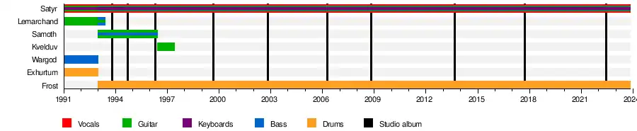 The band were formed in 1990 as Eczema[3] by the bassist Wargod and drummer Exhurtum. In 1991, they decided to start playing black metal and change the band name to Satyricon. Satyr (Sigurd Wongraven) then joined the band. After the first demo All Evil, Exhurtum was kicked out of the band because he "preferred hanging out with [his] girl at the time rather than kicking down gravestones together with the band",[3] while Wargod left the music scene and became a UN soldier afterwards.[4] Remaining members Satyr and Lemarchand hired the drummer Frost (Kjetil-Vidar Haraldstad) as a session musician and recorded their second and last demo, The Forest Is My Throne. Shortly after this, Lemarchand also left the band. But before leaving the band he recorded guitars (uncredited on the booklet) for the first full-length album, Dark Medieval Times. In the meantime, Frost was being "promoted" as a permanent member and had recorded drums for the aforementioned album. Satyricon have—with two exceptions—been a two-man band ever since: from 1993–1996, Tomas Thormodsæter 'Samoth' Haugen from Emperor was the bassist and guitarist of Satyricon, and participated in the recording of their second album, The Shadowthrone; and later, in 1996, Darkthrone member Nocturno Culto (Ted Skjellum, known as "Kveldulv" during Satyricon's period) became guitarist on the third full-length Satyricon album, Nemesis Divina.