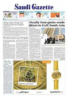 Saudi Gazette is an English-language daily newspaper[1] launched in 1976[2] and published in Jeddah, Saudi Arabia. It is only available online, as the print version was discontinued in 2019.[3] It is the second English-language daily newspaper in Saudi Arabia.[4]