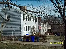 The site of Savage Mill on the rapids of the Little Patuxent River had been used for mill operations since the early 18th century. The district was part of a land grant named Ridgeley's Forest, surveyed in 1685 by Colonel Henry Ridgley.[2] In 1750, Alexander Warfield built a mill along the river which was eclipsed by a larger construction chartered in 1812 by the Williams Brothers.[3] By 1825, the mill employed 200 people including women and children, and 120 power looms for the production of cotton duck. The complex included several additions: a grist mill, an iron foundry, and a machine shop. The company was sold to William H. Baldwin, Jr. in 1847, who owned a Baltimore dry goods firm. In the early 20th century, the company became Baldwin, Leslie and Company, and the mill was expanded. A decade later the Baldwin family erected a stone community hall for the town and constructed a large group of tenant houses.[4] From 1923 to 1941 the Carroll Baldwin Memorial Community Hall served as a movie theatre.[5] For a brief period, the Maryland State Police set up a barracks in 1927-1929 leased from the Savage Manufacturing Company before relocating to Waterloo.[6] By 1941 the company employed 325 people, and during World War II, produced 400,000 pounds of cotton duck a month. In 1948 the mill closed, and in the 1950s it spent a brief period being used to manufacture Christmas ornaments before closing permanently and converted for commercial use.[6]