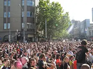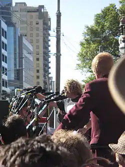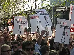 With the involvement of the second co-organiser Helen Marcou,[6] a planning meeting was then held on 2 February at the Bakehouse Studios complex in the inner-eastern Melbourne suburb of Richmond.[3] The organisation of the rally was undertaken exclusively by volunteers without the assistance of government funding.[7] Prior to the rally, which was scheduled for 23 February 2010, SLAM, FG4LM and Music Victoria all signed the Live Music Accord document.[7]