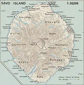 Savo is approximately circular, measuring approximately 6 kilometres (3.7 mi) by 7 kilometres (4.3 mi). It is located 15 kilometres (9.3 mi) northeast of Cape Esperance, the northern tip of Guadalcanal. The highest elevation is a 485 metres (1,591 ft) stratovolcano, which last erupted between 1835 and 1847.[3] The eruption was so strong that it wiped out all life on the island. An older eruption occurred in 1568. According to the World Organization of Volcanic Observatories (WOVO), the volcano is active every 100 to 300 years. On the island are geysers, hot mud lakes and hot springs.[4]