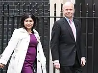 Sayeeda Hussain Warsi, Baroness Warsi, PC (/ˈvɑːrsiː/;[1] born 28 March 1971) is a British lawyer, politician, and member of the House of Lords who served as co-chairwoman of the Conservative Party from 2010 to 2012. She served in the Cameron–Clegg coalition, first as the Minister without portfolio between 2010 and 2012, then as the Minister of State for the Foreign and Commonwealth Office (styled as "Senior Minister of State") and as the Minister of State for Faith and Communities, until her resignation citing her disagreement with the Government's policy relating to the Israel–Gaza conflict in August 2014.[2]