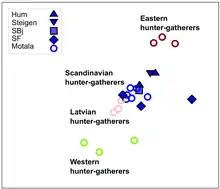 Haak et al. (2015) examined the remains of six SHGs buried at Motala between ca. 6000 BC and 5700 BC. Of the four males surveyed, three carried the paternal haplogroup I2a1 or various subclades of it, while the other carried I2c. With regard to mtDNA, four individuals carried subclades of U5a, while two carried U2e1. The study found SHGs to constitute one of the three main hunter-gatherer populations of Europe during the Mesolithic.[lower-alpha 4][lower-alpha 5] The two other groups were WHGs and Eastern Hunter-Gatherers (EHG). EHGs were found to be an ANE-derived population with significant admixture from a WHG-like source. SHGs formed a distinct cluster between WHG and EHG, and the admixture model proposed by Lazaridis et al. could be successfully replaced with a model that takes EHG as source population for the ANE-like ancestry, with an admixture ratio of ~65% (WHG) : ~35% (EHG).[8] SHGs living between 6000 BC and 3000 BC were found to largely be genetically homogeneous, with little admixture occurring among them during this period. EHGs were found to be more closely related to SHGs than WHGs.[7]