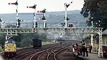 From 1907 until 2010 the station approaches were controlled from a 120-lever signal box named Falsgrave (at the outer end of platform 1 and close to the former excursion station at Scarborough Londesborough Road). In its final years Falsgrave box controlled a mixture of colour-light and semaphore signals, including a gantry carrying 11 semaphores. The signal box was decommissioned in September 2010 and the gantry was dismantled and removed in October 2010. Its new home was Grosmont railway station, on the North Yorkshire Moors Railway. The new signalling is a relay-based interlocking with two- and three-aspect LED signals controlled from an extension to the existing panel at nearby Seamer.[3][4] Simplification of the track layout and major renewals took place at the same time.