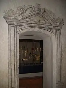 The owner Hans Johann Glich von Miltitz had the building interiors changed in 1617. Dendrochronological research on the remains of the original substructure showed that a tower was erected that year. He also had the portal rebuilt.[1]: 173 He provided the entrance hall and the central hall with a groined vault and a Hercules column.[2]: 99 He had several figures erected.[1]: 173 It is discussed in the literature whether he elevated the second floor of the left side arcade wing.[1]: 175f