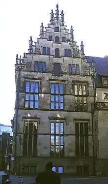 In 1547, the merchants of Bremen charged the Flemish mason and architect Johann den Buschener from Antwerp, who constructed a new building in 1538/39. Due to financial limits, the fine design of the façades lasted much longer. Buschener only completed the stepped western gable, which is on the borderline of Late Gothic and of Renaissance style, and the main entrance, which was not yet central. The eastern gable, pure Renaissance, was crafted in 1565 by a local mason named Karsten Husmann. In 1594, the cornice overlooking the market square was enhanced by a magnificent maritime gable. Lüder von Bentheim, the architect of the Renaissance refresher of the townhall, was engaged in it, too.