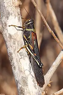 The large painted locust[1] (Schistocerca melanocera) is endemic to the Galapagos Islands of Ecuador, except Española Island. The locusts form a large part of the diet of the Galápagos hawk and lava lizards. Can be up to 8 cm long.[1]