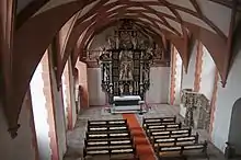 Small round stairway towers are located in the four corners of the court. The Schlosskirche or chapel is in the north wing. It extends through the ground and upper floor, with a rib vault referencing Gothic style. The chapel's altar, made from alabaster and marble, is by Hans Juncker. It features a statue of Johann Schweikhard von Kronberg, holding a model of the castle.[2]:74