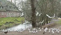 A preserved sandstone portal from the 17th century leads to the "Großer Garten" (Great Garden) located to the north and east of the castle. This outer castle garden was redesigned in its current form in 1878 by the Hamburg Garden architect Rudolph Jürgens as a newly acquired municipal park for the city of Husum. The castle park, with its lawns, circular paths, and groups of trees, is designed as a landscape garden. The park is well-known regionally for its annual Husum crocus blossom, a mass blooming of crocuses that form a purple carpet in the park during spring, consisting of around five million Crocus napolitanus. The crocuses were likely planted during the time of the duchesses, and they may even trace back to the Gray Monks' attempts to cultivate saffron, although it was not possible with Crocus napolitanus. Crocuses have survived as stink plants to this day. [23][24]