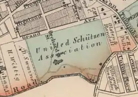 In 1864, nearby Union Hill was set apart from North Bergen as a separate municipality that had been originally settled by a group of German-Americans as early as 1851.[7] In 1872, the United Schützen Association opened a park on the site of the "Old Mansion" of the Wright family (see 1873 map illustration), featuring a new dancing pavilion, music stand and shooting gallery in addition to the landscape elements and green houses "just as Mr. Wright left them."[8] The Plattduetsche Volksfest Vereen organization of New York and New Jersey (PVV), which was created in 1874, purchased the property in 1894. It expanded into an amusement park that featured three dancing pavilions and ten bowling alleys, which entertained up to 50,000 attendees at a time with vaudeville performances and tournaments, parades, and fireworks.[9] Schuetzen is a derivative of the German word Schütze, meaning "shooter" or "rifleman". Originally encompassing about 32 acres,[6][9] the park's location on the western cuesta of the Hudson Palisades was chosen so that bullets could be directed into the side of the hill. Target practice continued at the park until 1935.[1] Over the years much of the property was sold off, a large portion of which was acquired by the government to build Route 495 leading to the Lincoln Tunnel.[9]