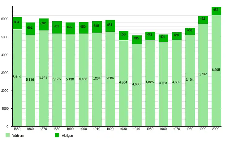 Schwarzenburg has a population (as of December 2020) of 6,812.[6] As of 2011, 4.7% of the population are resident foreign nationals. Over the last year (2010-2011) the population has changed at a rate of 0.7%. Migration accounted for 0.8%, while births and deaths accounted for -0.2%.[7] Most of the population (as of 2000) speaks German (96%) as their first language, French is the second most common (0.8%) and Italian is the third (0.4%).[7]