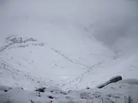 Prior to walking this ridge there is another ridge around 2 feet wide with a sheer rock face up to the right and an 800-metre drop to the left with only a steel cable to hold onto.