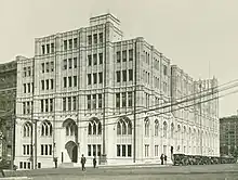 A complex series of real estate transactions, land swaps and compensation agreements enabled the Presbyterian Church to reconstruct their church and offices on the original but enlarged site, facing both Lang Park and Wynyard Park, with frontages to Jamieson, York, and Margaret Streets. An architectural competition was held in 1927 for designs for a new Presbyterian Assembly Hall and associated offices. The brief called for a building which would be a monument appropriate to the universal character and inherent nobility of Presbyterianism; a material consummation of the church's pioneer efforts in this new world of Australia, and an appreciation of the substance and vitality which actuate the church towards problems of the future. Twenty-seven designs were submitted in the first stage of the competition and were judged by Norman Weekes. The winning design was selected in May 1928 but it was not until April 1929 that tenders were called and work commenced on the site in July 1929.[1]