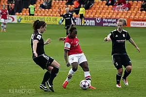 In the 2002–03 season, Kilmarnock became the champions, after a title race with Hibernian.[7][8] Kilmarnock Ladies had formed from the 1971 Scottish Women's Cup-winners Stewarton Thistle,[6] and Killie also won the 2001–02 SWFL, two Scottish Cups, and four consecutive League Cups. Kilmarnock's success faded after the departure of manager Jim Chapman and of Scotland internationals including Shelley Kerr,[9] Joanne Love and Linda Brown.[10]