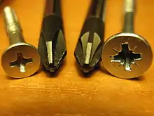 Reed and Prince, also called Frearson, is another historic cross-head screw configuration. The cross in the screw head is sharper and less rounded than a Phillips, and the bit has 45° flukes and a sharper, pointed end. Also, the Phillips screw slot is not as deep as the Reed and Prince slot.[19][20][21] In theory, different size R&P screws fit any R&P bit size.[22]