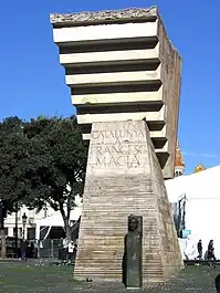 | Monument to Francesc Macià | Josep Maria Subirachs | Travertine, concrete, iron and bronze | 9,11 x 3,66 x 7,95 | Installed in 1991, this monument was the last sculpture placed in the square to date. It faces the Ramblas, next to Clarà's Goddess. In honor of the president of the Generalitat Francesc Macià, Subirachs conceived the work as an evocation of the various symbols of Catalan identity: the pedestal, made of travertine with a succession of blocks of stone in a break, represents the history of Catalonia; the upper part, made of concrete, is shaped like an inverted staircase, of which the first three steps, embedded in the pedestal, represent the three years of Macià's government at the head of the Generalitat, while the rest, ending abruptly and unfinished, symbolize the future of the country, which is being built day by day, step by step; Also, on the pedestal there are several inscriptions in the form of graffiti, with names, dates and places related to the Catalan politician, while at the top is in large letters the inscription Catalunya a Francesc Macià (Catalonia to Francesc Macià). On the back is the coat of arms of Catalonia, made of iron, and is engraved with a phrase of the president addressed to the Catalan deputies in 1932. In front of the body of the monument there is a separate monolith with the bust of President Macià, made in bronze, a replica of the portrait made by Josep Clarà in 1932. Subirachs wanted to give it a realistic air, which contrasts with the almost abstraction of the rest of the monument, to have a link with the noucentist style of the rest of the square. Foundry: Parellada (Lliçà d'Amunt).[47] | ![]() |
