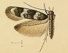 The wingspan is 7–10 mm. The forewings are black, with a few greyish white scales at the base and two greyish white transverse bands. The hindwings are dark leaden grey.[2]