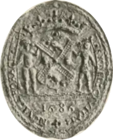 In 1683, the city's Common Council petitioned the colonial governor of New York for an official charter, including the right to designate their own seal. In 1686, the charter was granted. It included the right of the city to "breake Change Alter and new make their said Comon Seale when and as often as to them it shall seem convenient".[14] The city's Common Council then adopted a new seal on July 24, 1686, the first to be designed and approved by the city in its own right. The design contained many elements that survive in the current city seal—namely, a shield featuring windmill sails, beavers, and flour barrels, a colonial sailor and a Native American as supporters, a Latin legend, a founding date (in this case, 1686 was used), and a laurel wreath. The first known use of the 1686 seal reveals that the seal featured a ducal crown at the crest, a fact that has puzzled historians, since the city's owner and namesake, James II, had ascended to the throne of England in 1685, and thus the use of an imperial crown would have been warranted. Subsequent uses of the seal show that a change to an imperial crown was made, although the exact date of the change is unknown.[15]
