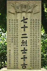 The dead were buried together in one grave on the Yellow Flower Mound, a mound near where they fought and died which has lent its name to the uprising.[2] After the Chinese revolution, a cemetery was built on the mound with the names of those 72 revolutionary nationalists. They were commemorated as the "72 martyrs."[2] Some historians believe that the uprising was a direct cause of the Wuchang uprising, which eventually led to the Xinhai Revolution and the founding of the Republic of China. Among the martyrs who sacrificed themselves was revolutionary Lin Chueh-min.[5]