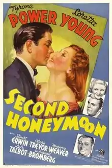 Second Honeymoon is a 1937 American screwball romantic comedy film directed by Walter Lang and starring Tyrone Power, Loretta Young and Stuart Erwin. Based on a story by Philip Wylie it was distributed by Twentieth Century-Fox. A comedy of remarriage, it was overshadowed by the similar The Awful Truth released the same year.[1]