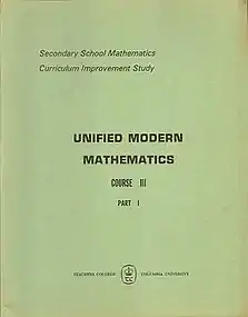 The course books put out by SSMCIS were titled Unified Modern Mathematics, and labeled as Course I through Course VI, with the two volumes in each year labeled as Part I and Part II.[11] Materials for the next year's course were prepared each year, thus keeping up with the early adoption programs underway.[9] Using largely formative evaluation methods for gaining teacher feedback,[17] revised versions were put out after the first year's teaching experience.[10] By 1973, the revised version of all six courses had been completed.[10] The first three volumes were put into the public domain for any organization to use.[4]