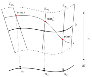 For example, when is a vector bundle a section of is an element of the vector space lying over each point . In particular, a vector field on a smooth manifold is a choice of tangent vector at each point of : this is a section of the tangent bundle of . Likewise, a 1-form on is a section of the cotangent bundle.