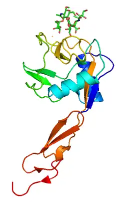Each selectin has a carbohydrate recognition domain that mediates binding to specific glycans on apposing cells. They have remarkably similar protein folds and carbohydrate binding residues,[1] leading to overlap in the glycans to which they bind.