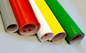 Self-adhesive plastic sheet, known in the United Kingdom as sticky-backed plastic, is wide plastic sheet or film with an adhesive layer on one side, used as a surface coating for decorative purposes. It is typically smooth and shiny, but can also come in textured varieties, in which case it can sometimes be used as a cheap alternative to veneer. The plastic is often PVC. The sheeting is typically sold with a removable paper release liner to prevent it from adhering prematurely.