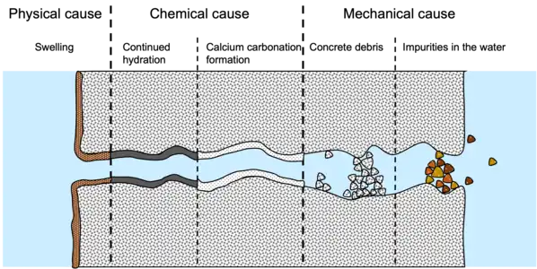 Autogenous healing of cementitious materials influences crack self-closure and, subsequently, durability and physical-mechanical performance of composites. It is considered to be one of the main reasons for substantial life extension of ancient structures and buildings.[14] Autogenous self-healing in cement-based composites was first noticed by the French Academy of Science in 1836, when cracks in pipes, water-retaining structures, etc., self-healed.[15] Significant theoretical and experimental research in the 1900s demonstrated that autogenous self-healing processes are mostly linked to physical, mechanical, and chemical processes inside the cementitious matrix are shown in the scheme.[16] During the so-called "surface-controlled crystal development" that occurs when cracking is induced, calcium ions are immediately accessible from the fracture faces, and crystal growth is accelerated. After an initial layer of calcite is formed on the crack walls and the surrounding concrete matrix becomes less rich in calcium ions, the transition to the so-called "diffusion-controlled crystal growth" occurs, which means that the Ca2+ ions must diffuse through the concrete, and the CaCO3 layer in order to reach the crack surface and ensure the precipitation of the healing products. Clearly, the second phase is much slower than the first. In the case of composite cement, including pozzolanic additions, a portion of the calcium hydroxide, which has been identified as a primary source of Ca2+ ions, is used in the particular pozzolanic reaction for CSH formation. This will result in a delayed and weaker precipitation of calcium carbonate. Other minor mechanisms depicted in the scheme include the swelling of hydrated cement paste along the crack walls due to water absorption by calcium silicate hydrates and mechanical crack blocking by means of debris and fine concrete particles, direct results of the cracking process or as a result of impurities in the water entering the crack.[6] Autogenous healing mechanisms are only effective for small cracks, although there is a wide range of maximum widths for healable cracks: 10–100 µm, sometimes up to 200 µm but less than 300 µm, only in the presence of water.[6] They are challenging to control and forecast because to their usually scattered outcomes and dependence on a number of factors and variables. 1) the age and composition of the concrete itself, 2) the presence of water, and 3) the thickness and form of the concrete fracture are the most influential elements.[6]