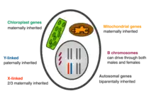 Genetic conflicts often arise because not all genes are inherited in the same way. Examples include cytoplasmic male sterility (see Selfish mitochondria). While mitochondrial and chloroplast genes are generally maternally inherited, B chromosomes can be preferentially transmitted through both males and females.