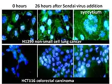 Sendai virus (SeV) is a member of the genus Respirovirus.[5][6] The virus was isolated in the city of Sendai in Japan in the early 1950s. Since then, it has been actively used in research as a model pathogen. The virus is infectious for many cancer cell lines (see below), and has oncolytic properties demonstrated in animal models[7][8] and in naturally-occurring cancers in animals.[9] SeV's ability to fuse eukaryotic cells and to form syncytium was used to produce hybridoma cells capable of manufacturing monoclonal antibodies in large quantities.[10]
