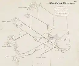 Senghenydd (Welsh: Senghennydd) is situated at the northern end of the Aber Valley, approximately four miles (6.4 km) north-west of Caerphilly[16][17] and eleven miles (18 km) north-west of Cardiff.[18] When geological surveys for coal began in 1890 it was a farming hamlet of around 100 people.[19][20] Coal was found, and sinking of the first mineshaft for Universal Colliery—which was owned and developed by William Lewis[lower-alpha 3]—began in 1891; the first coal was extracted in 1896.[17][22] The colliery's two shafts were both 1,950 feet (590 m) deep, the downcast Lancaster and the upcast York.[23][lower-alpha 4] Development of the pit coincided with the Boer War, and sectors of the underground workings were named after key places in the war, such as Pretoria, or the lifting of the sieges at Ladysmith, Mafeking and Kimberley.[20]