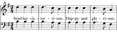 A well-known popular example of a threefold descending fifths diatonic sequence is found in the refrain from the Christmas carol "Angels We Have Heard on High,"[4] as illustrated immediately below ("Glo...ria in excelsis Deo"). The one-measure melodic motive is shifted downward at the interval of a second, and the harmonic aspect does so likewise by following the circle of fifths ⓘ: