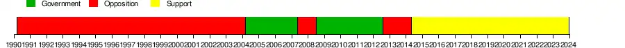 | Year | Leader | Popular vote | % of popular vote | # | # of seats | Seat change | Coalition | Status |