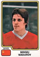 Sergei Mikhailovich Makarov (Russian: Серге́й Миха́йлович Мака́ров; born 19 June 1958) is a Russian former ice hockey right wing. Makarov played on the gold-winning Soviet Union men's national ice hockey team at eight World Championships, and in the 1981 Canada Cup. At the Winter Olympics, he won the gold medal in 1984 and 1988 and a silver in 1980 . In the Soviet Union, Makarov played 11 championship seasons with CSKA Moscow (Red Army), winning the Soviet Player of the Year award (also known as Soviet MVP) three times. Together with Igor Larionov and Vladimir Krutov, they formed the KLM Line, one of the most talented and feared lines ever to play hockey. He was awarded Order of the Red Banner of Labour (1984). He later played in the National Hockey League with the Calgary Flames, and won the Calder Memorial Trophy as rookie of the year at the age of 31. In 2001, Makarov was inducted into the IIHF Hall of Fame. In 2017, he was inducted into the Hockey Hall of Fame. He was voted one of six players to the International Ice Hockey Federation's (IIHF) Centennial All-Star Team in a poll conducted by a group of 56 experts from 16 countries.[1]