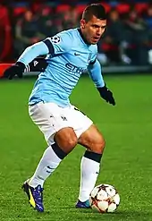 Sergio Leonel Agüero del Castillo (born 2 June 1988), also known as Kun Agüero,[5] is an Argentine former professional footballer who played as a striker. He is considered one of the best strikers of his generation and one of the greatest players in the history of the Premier League, during his decade-long association with Manchester City.[6][7][8] He is the club's all-time top goalscorer and holds the record for most Premier League hat-tricks, with 12.