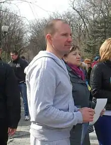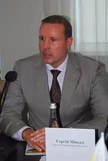 Serhiy Anatoliyovych Minko (born September 20, 1973, Pavlodar, Kazakh SSR, USSR) is a Ukrainian politician, businessman, public figure and philanthropist who served as Mayor of Melitopol from 2015 to 2019. He previously served as Secretary of the Melitopol City Council and Acting Mayor in 2014–2015. People's Deputy of Ukraine of the IX convocation.[1][2]