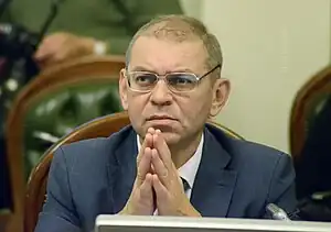 In October 2019 the State Bureau of Investigation opened an investigated into Pashynskyi for allegedly "causing grievous bodily harm to a citizen" during a shooting incident in 2016 in which Pashynskyi shot a man in the leg after allegedly being attacked by him (the person shot claimed it was vice-versa).[34][35] On 7 October 2019, Pechersky District Court of Kyiv decided to detain Pashynskyi until 4 December 2019 (without bail).[36][37] On 18 October, Court of Appeal upheld the decision to detain the former deputy.[38]