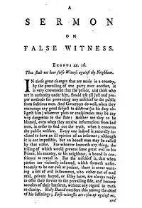 "On False Witness" was given in 1715.[50] Its introductory passage from scripture comes from Exodus 20:16 – "Thou shalt not bear false witness against thy neighbour."[51]