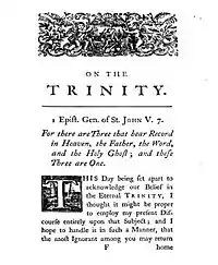 Its introductory passage from scripture comes from First Epistle of John 5:7 – "For there are three that bear record in Heaven, the Father, the Word, and the Holy Ghost; and these Three are One."[17]