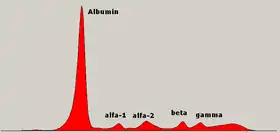 Serum protein electrophoresis (SPEP or SPE) is a laboratory test that examines specific proteins in the blood called globulins.[1] The most common indications for a serum protein electrophoresis test are to diagnose or monitor multiple myeloma, a monoclonal gammopathy of uncertain significance (MGUS), or further investigate a discrepancy between a low albumin and a relatively high total protein. Unexplained bone pain, anemia, proteinuria, chronic kidney disease, and hypercalcemia are also signs of multiple myeloma, and indications for SPE.[2] Blood must first be collected, usually into an airtight vial or syringe. Electrophoresis is a laboratory technique in which the blood serum (the fluid portion of the blood after the blood has clotted) is applied to either an acetate membrane soaked in a liquid buffer,[3][4] or to a buffered agarose gel matrix, or into liquid in a capillary tube, and exposed to an electric current to separate the serum protein components into five major fractions by size and electrical charge: serum albumin, alpha-1 globulins, alpha-2 globulins, beta 1 and 2 globulins, and gamma globulins.