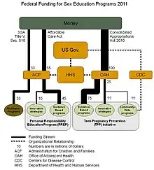 The funding includes the December 16, 2015 release of the FY 2016 Omnibus Funding Bill, The Consolidated Appropriations Act.[50] The Omnibus Bill includes $101 million of level funding for TPP, the Teen Pregnancy Prevention Program from the Office of Adolescent Health (OAH).[51] Evaluation funding in the FY 2016 Omnibus Bill remained at $6.8 million, as it had been in FY 2015. The Center for Disease Control's Division of Adolescent School and Health (DASH) was funded a $2 million increase from the previous year's funding level, resulting in $33.1 million in federal funding.[50] $75 million was funded to the Personal Responsibility Education Program, an inclusive education program which provides information on contraception and the prevention of pregnancy and STIs and abstinence.[17]