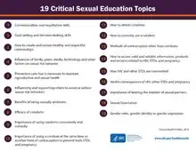 Common curriculum in American schools' sex education classes include "instruction on sexual health topics including human sexuality. HIV or STI prevention and pregnancy prevention are more commonly required in high school than in middle or elementary school."[16][17] Statistics provided by the Center for Disease Control (CDC) reveal that between 2000 and 2014 the portion of schools providing information on sexual health education, including topics such as abstinence, puberty, and how to properly use a condom, declined.[16][17][18] The CDC has identified 19 Critical Sexual Education Topics that should be taught in all middle and high schools. In 2014, fewer than half of high schools and only 20% of middle schools provided instruction on all 16 topics that the CDC considers essential to sexual health education.[16]